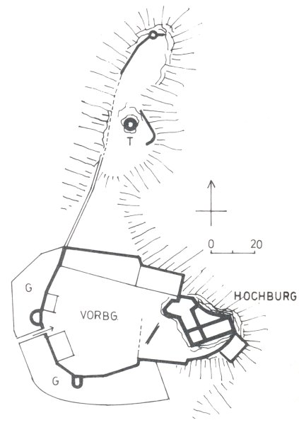 Die Hochburg auf dem Felsen wurde 1874 größtenteils abgebrochen. Der Burgadel wird 1216 urkundlich erwähnt. Die Vorburg entstand im 16. Jahrhundert. Im Norden sind Reste von Burgmannensitzen zu erkennen.